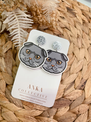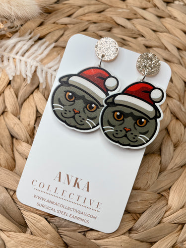 Scottish Fold Gray Cat Dangle Christmas Earrings