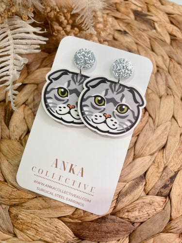 Scottish Fold Stripped Gray Cat Dangle Earrings