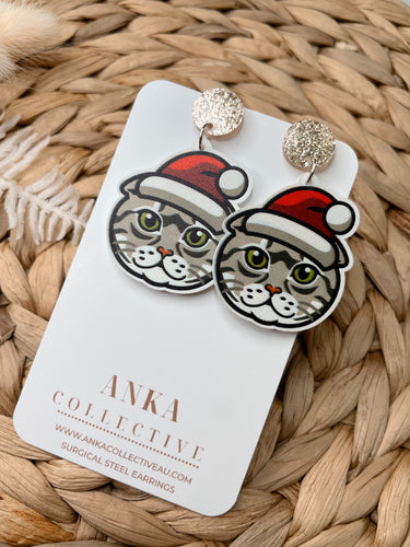 Scottish Fold Stripped Gray Cat Dangle Christmas Earrings