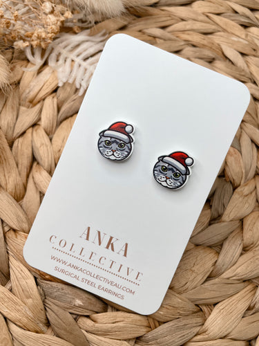 Scottish Fold Stripped Gray Cat Stud Christmas Earrings