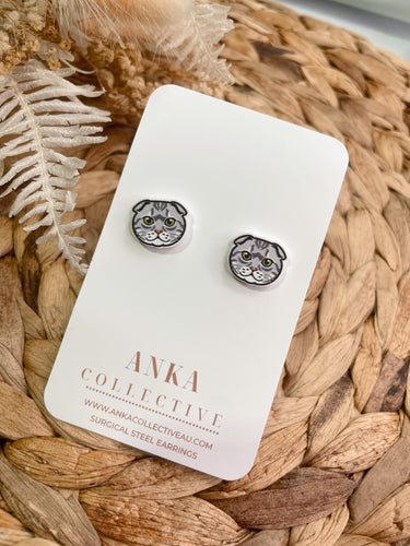 Scottish Fold Stripped Gray Cat Stud Earrings