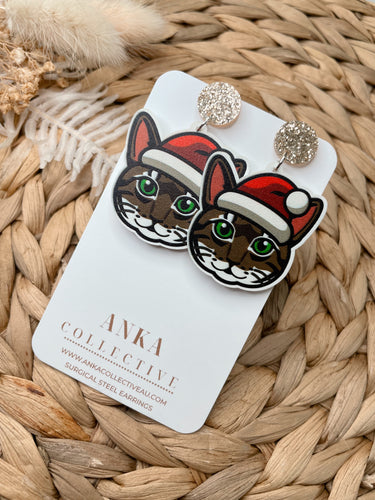 Tabby Brown Cat Dangle Christmas Earrings