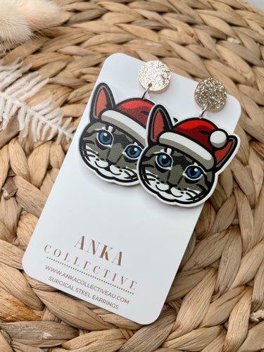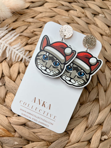 Tabby Grey Cat Dangle Christmas Earrings