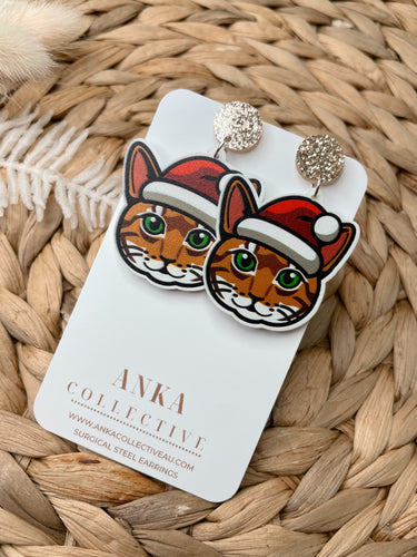 Tabby Orange Cat Dangle Christmas Earrings