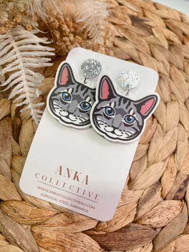 Tabby Grey Cat Dangle Earrings